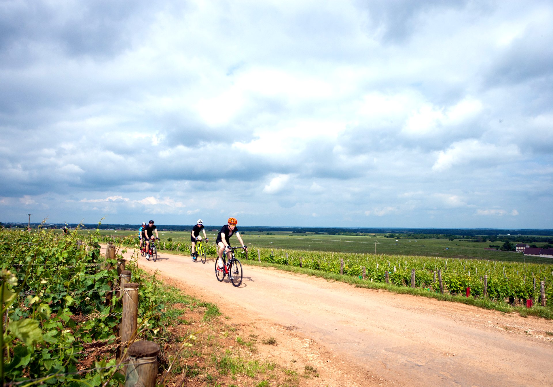 The access roads in and around the famous vineyards are rarely paved, but as we dart back into our host village for lunch, we take a small detour past the chateaus, and onto the dusty roads. Veikkanen points out they’re like the white dust of Strade Bianche in Tuscany, and the joke continues as Fournier jumps a rock, landing heavily and flatting.