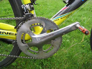 Other sponsors include Italian company Miche, but unfortunately for Backstedt his shipment of components hadn’t arrived yet so a mainly Campagnolo Record 10-speed groupset had to suffice. Interestingly, a Shimano Dura-Ace 7800 chainset with 180mm length arms was pressed into the bottom bracket shell. Brakes were supplied by Miche however, with cool-looking carbon calipers.