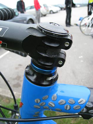 ![]() A couple of spacers underneath the stem, plus one above – which allows extra room for the steerer tube to reach through the stem |