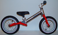 The jumper model is the aluminum framed version of the bike designed to be pedal-less so a toddler can control the vehicle with their feet.