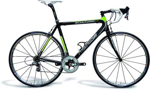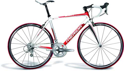 Merida’s small (in comparison with its mountain bikes) road range is headed by the Scultura Evo Team-20. The frame, a full-carbon item made using nano technology and featuring carbon dropouts and ‘Flex-Stay’ chainstays, is claimed to weigh close to 900g. The Featherlight fork is made using ’Double-Chamber’ technology with reinforcing internal ribs for lateral stiffness. The £3,999.99 Team-20 gets a full SRAM RED groupset, Mavic R-SYS wheels and FSA finishing kit.