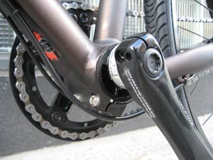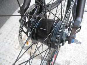 The finish to the Alfine components is exceptional, as is that of the frame and fork. Chain tension, a potential problem with the frame mounting required for a disc brake, is taken care of by a tandem-style eccentric bottom bracket mount.