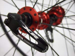 Notable features include bearing adjustment with the wheel in the frame or fork, machined braking surfaces for the medium profile rims and blades spokes that get broader and thinner near the rim, where the aerodynamic advantages of aero spokes are considered to be at their greatest.