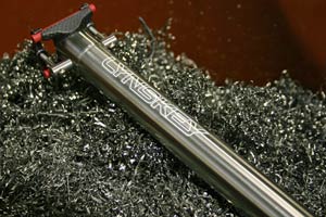 Made from 3al/2.5v titanium to the same high standards that their framesets are renowned for, it’s light at a claimed 170g for a 350mm length post and uses a ‘tension rod’ to transmit all stresses through the length of the seatpost.