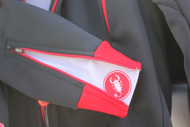 The £230 Espressso Due jacket is one made from honeycombe-structured X-Fast fabric with numerous hidden channels for ventilation. One is positioned each side of the garment, just off the chest, to channel air across the back, which is constructed from a mesh panel intended to be sufficiently light to avoid pressing directly against the skin. A full length zip is secured with a cam lock (a feature on all Castelli jackets this winter) to prevent the zip from sliding down further than required when riding. A hidden channel is included to route a phone or headphone cable. Unusually for Castelli, who, in common with most Italian manufacturers cut their garments on the small side, the fit of the Espressso Due is more “relaxed”. It comes in black with red detailing and is intended for temperatures from zero to 12 degrees centigrade.