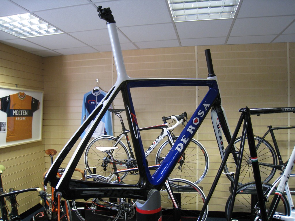 A new paintjob for De Rosa’s stunning ready-to-race top-end carbon frame, with integrated seatmast and chuffing massive chainstays. It also features interestingly routed cables, they’re routed through the head tube and pop out the other side and run down ‘channel’s underneath the downtube.