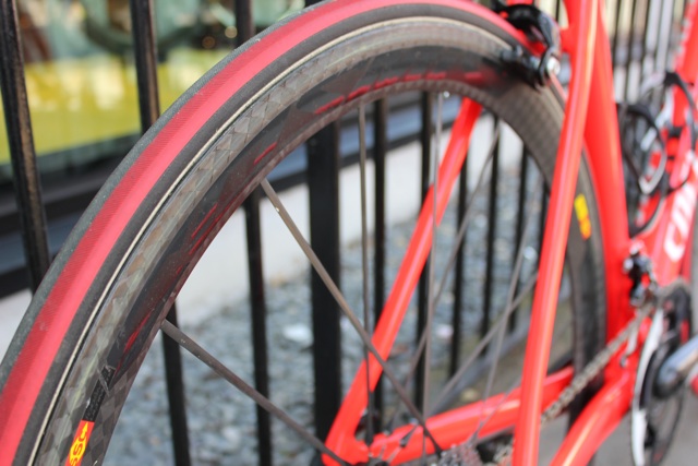 He rolls on Mavic’s super lightweight Cosmic Carbone Ultimates, a 40mm carbon rim with flattened carbon spokes