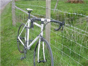 The frame is handmade using a technique pioneered for bicycle frames by Pegoretti himself. Tungsten Inert Gas, or TIG, welding which means that the steel-tubed frame has no lugs at the tube joins. Instead, there are neat welds and the areas between top tube and down tube are almost seamless. The custom barb wire paint job on white drew a few double takes from passers by in the streets.