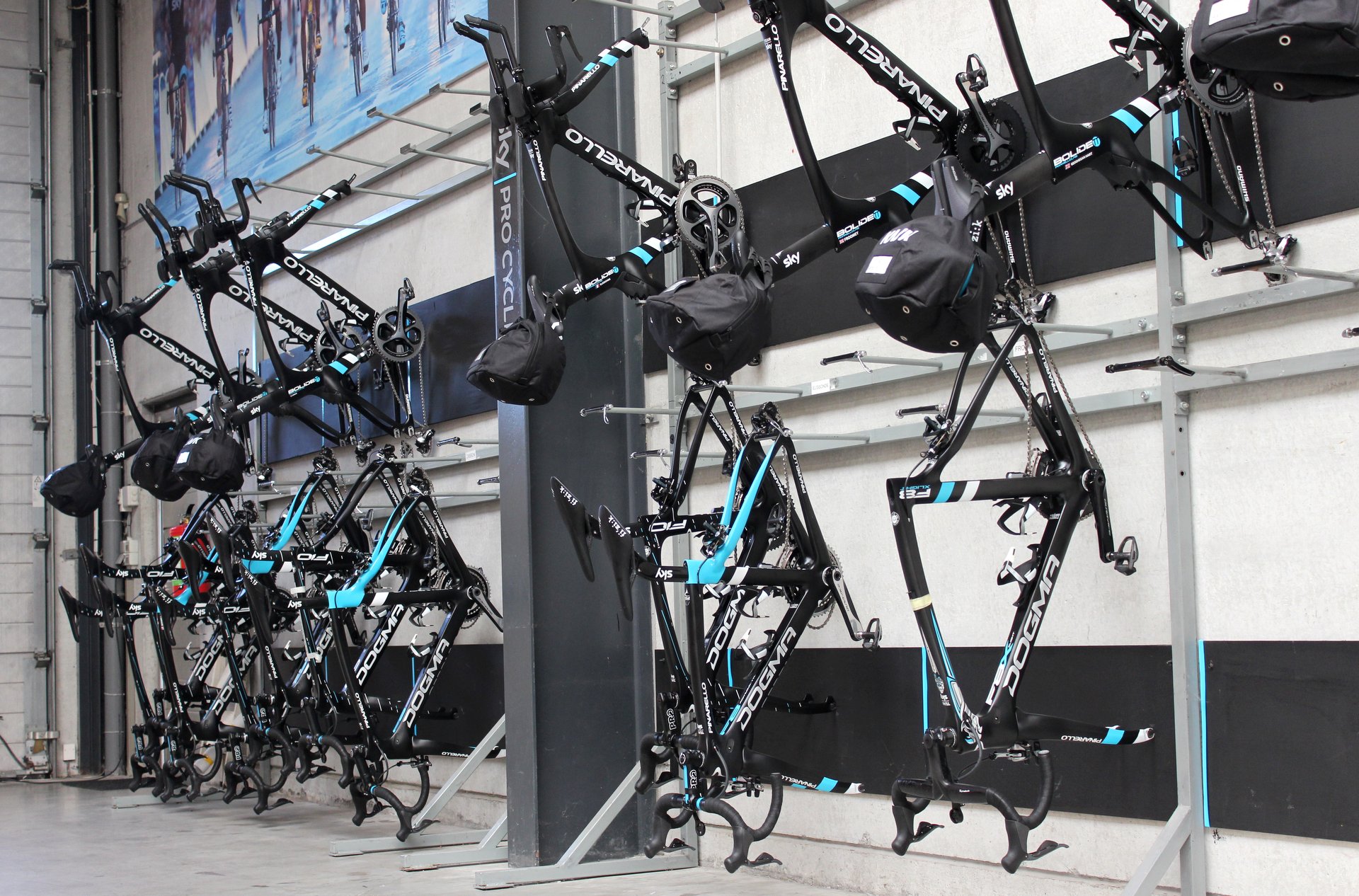 Each Team Sky rider typically has seven bikes. Two of those are kept at home for training but the other five - three road bikes and two time trial bikes - are kept in the service course when not at races.