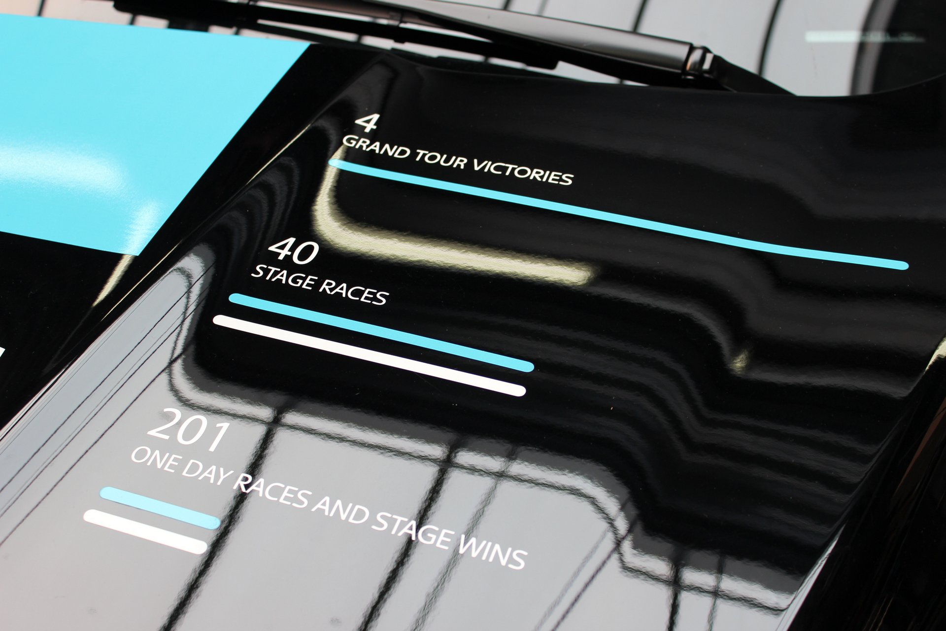 Team Sky switched clothing sponsor to Castelli at the start of 2017 and introduced a new jersey design as a result, based on the team's wins over the years. The lineated design carries over to the vehicles.