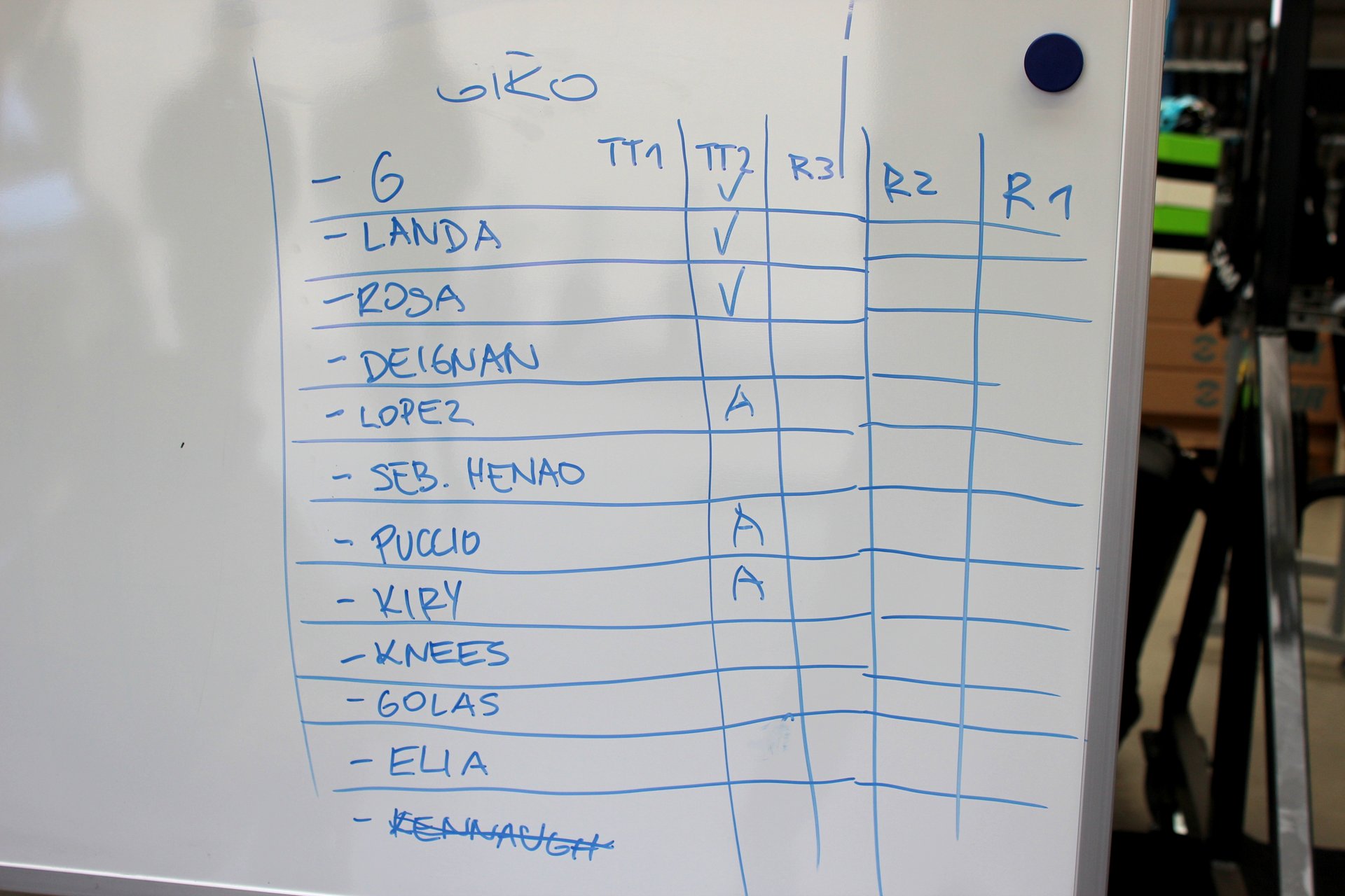 We visited the service course between the end of the Classics and the start of the Giro d'Italia and this mechanics to-do list gave an indication of the squad set to be picked for the Giro. Each rider will have three road bikes (with R1 being the preferred race bike) and two TT bikes for the first Grand Tour of the season.