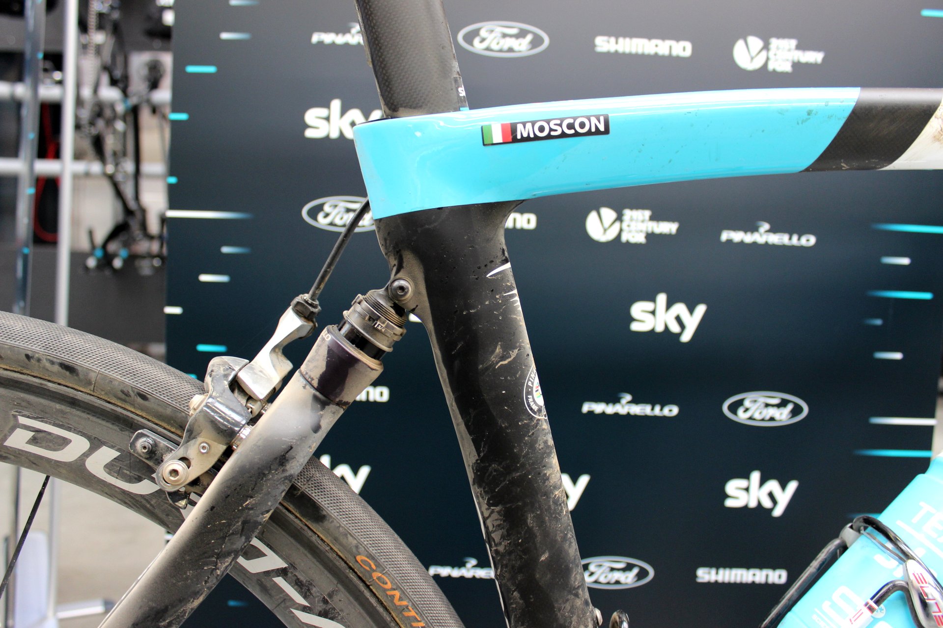 The Pinarello Dogma K8-S, still covered in dust from the cobbles, uses a micro-suspension to soften the punishment dished out by the pavé. Moscon had started the race on a second generation design, which allows the suspension to be locked out when not on the cobbles, but switched to this bike after a mid-race mechanical.
