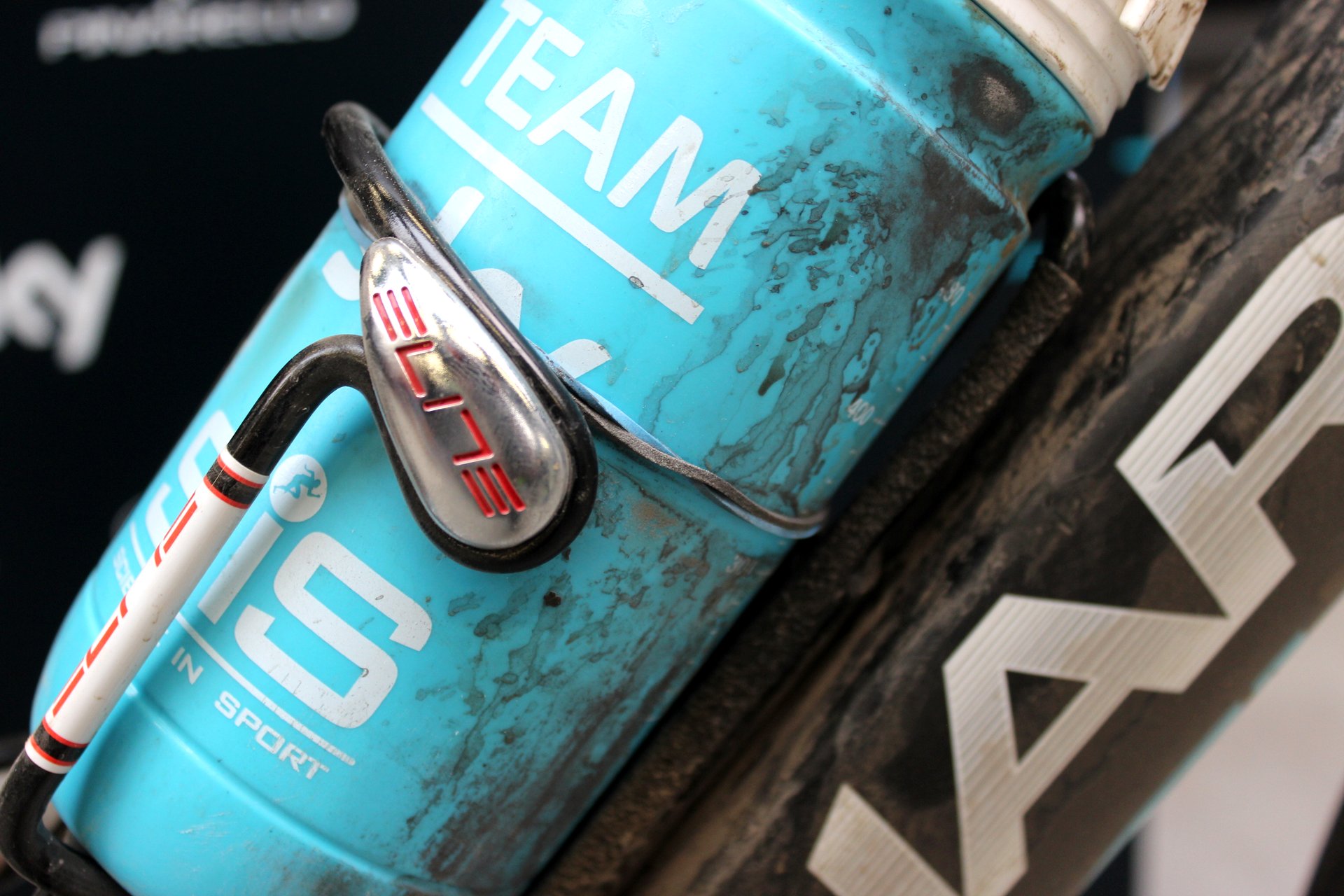 Team Sky have left the bike unwashed as Pinarello have requested to use the machine, dust and all, for display in their headquarters. The elastic band on this bottle would have strapped an energy gel to the bidon when it was passed from the team car.