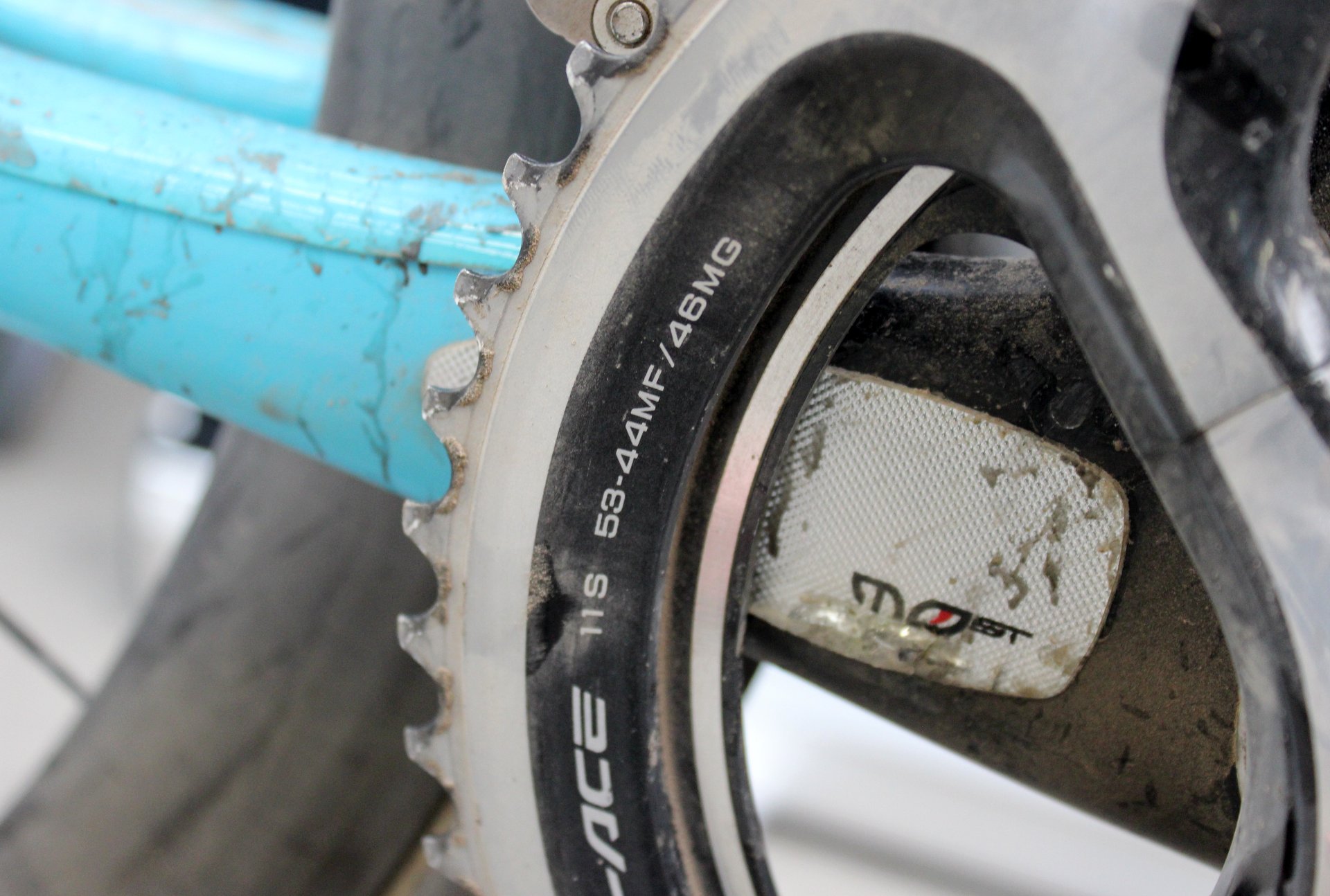 With the Paris-Roubaix course being largely flat, the majority of riders use a bigger inner chainring than normal, with Moscon option for a 53-44t combination.