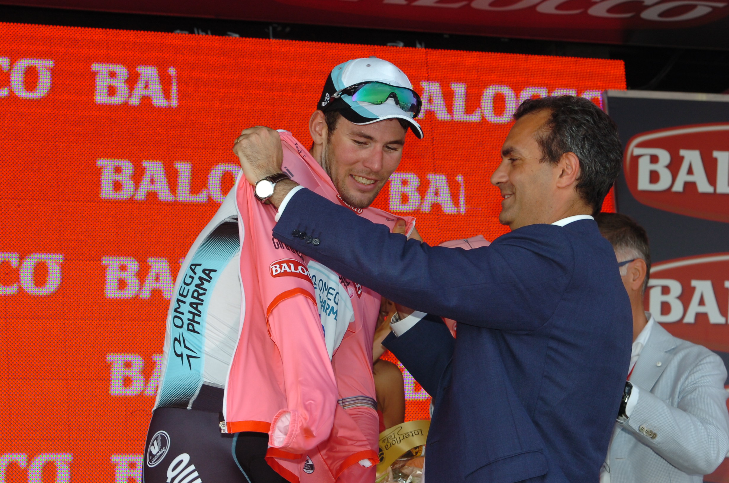 Mark Cavendish pulls on the first maglia rosa of the 2013 Giro d’Italia – the last Brit to do so (Pic: Sirotti)