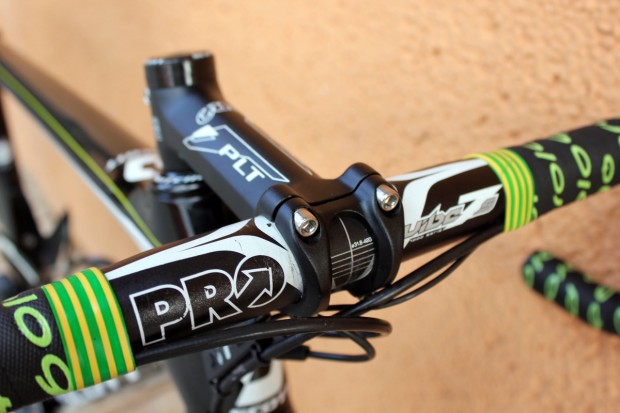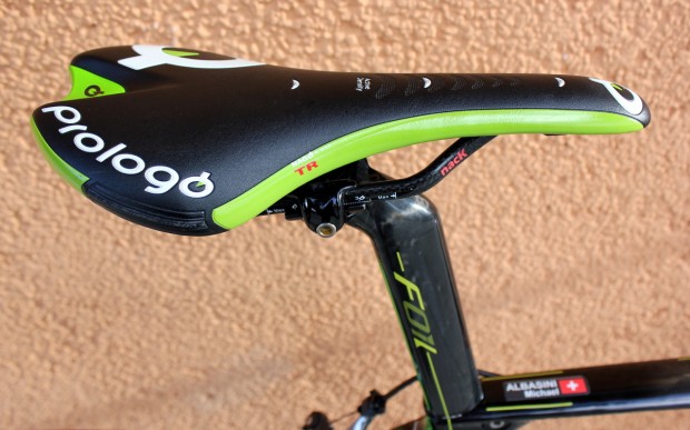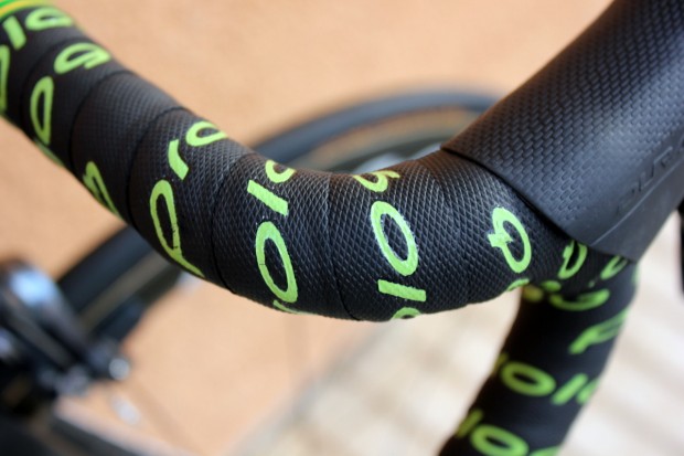 The frame’s green and yellow paintjob is a subtle nod to the team’s Australian heritage and this custom, colour-matched Prologo ‘bar tape is a nice finishing touch