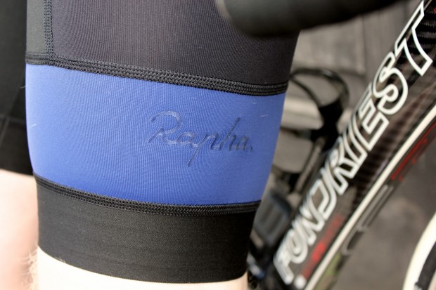The deep, elasticated hems are lined internally with three thin silicone strips. Externally, the left leg is finished with Rapha’s now trademark contrast band, available in white, red, or blue.