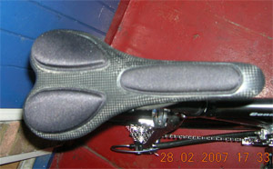 The frame is a Condor Baracchi, which has been resprayed by Condor from its original blue/orange to matt black. Chainset is a Truvativ Rouleur triple, with Shimano Ultegra front and rear mechs, Dura Ace brakes and bar end shifters and Dura Ace wheels. As you can see in one of the pics, the saddle is a piece of carbon with 3 bits of foam stuck on it, and it is surprisingly very comfortable.