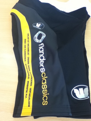 Their Flanders Classics-themed kit consists of an unlined short and short sleeved jersey, both in black with yellow detailing and printed with the names of the best-known northern Classics: Omloop Het Nieuwsblad, Dwars door Vlaanderen, Gent-Wevelgem, Ronde Van Vlaanderen, Schelderprijs, and Barbantse Pijl.