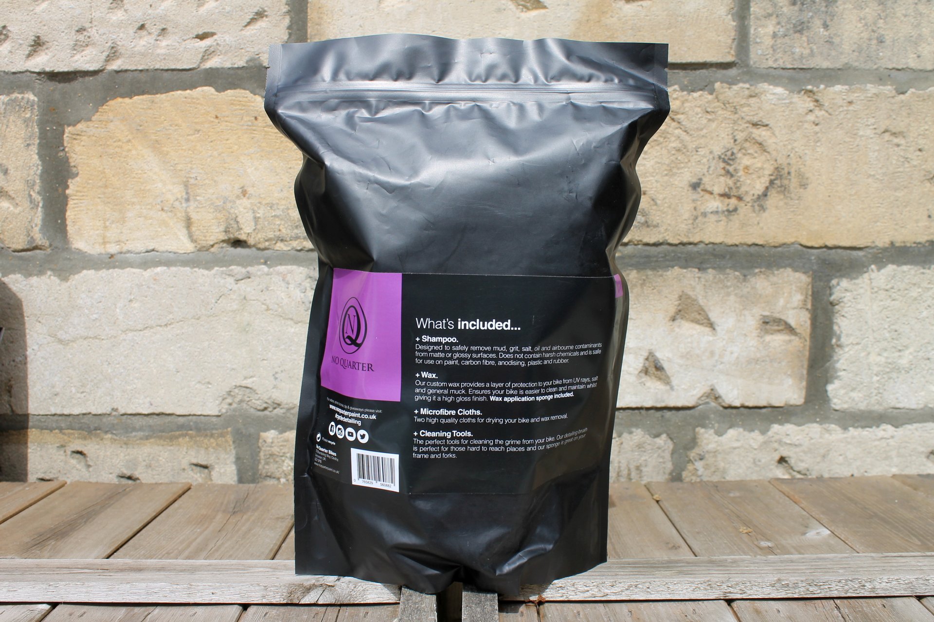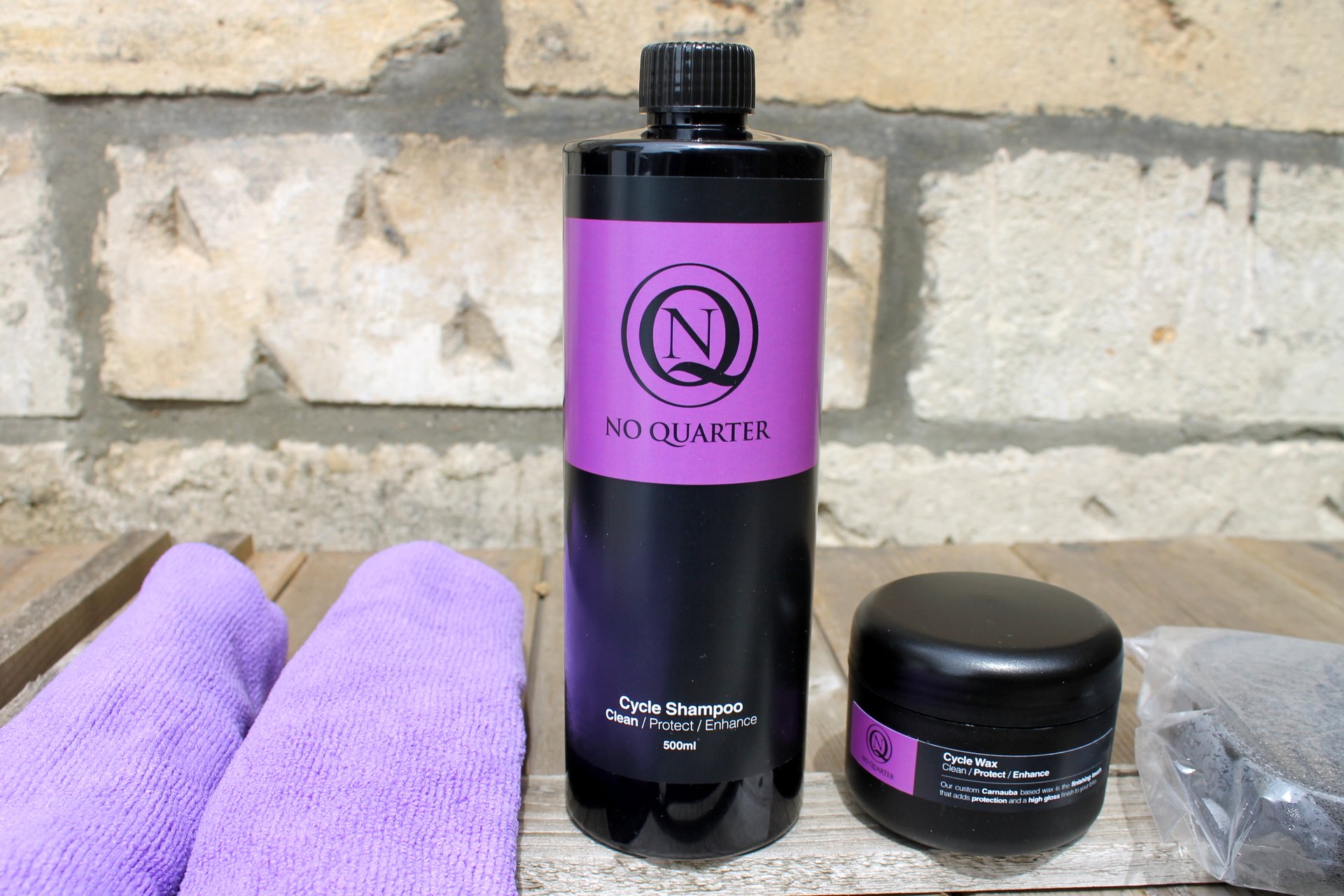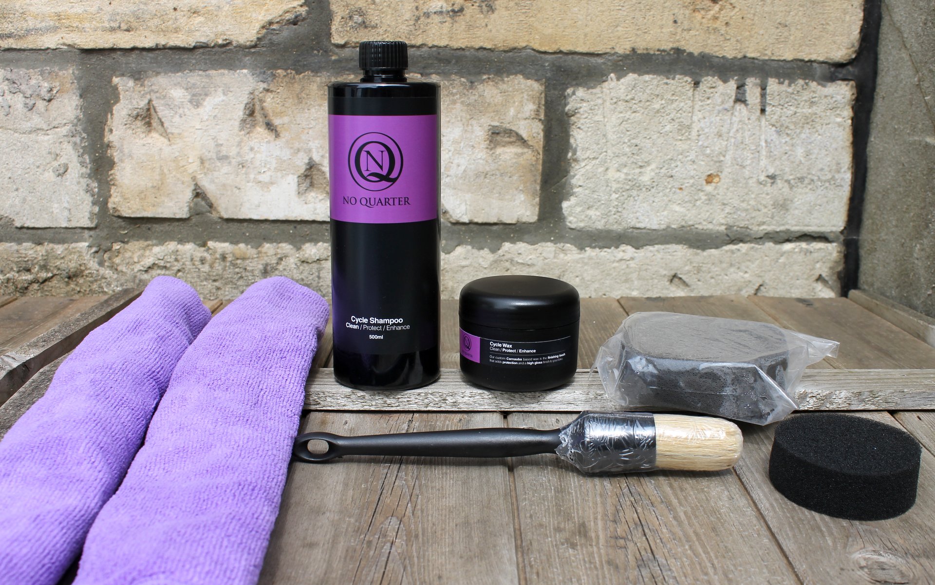 The No Quarter Cycle Detailing contains bike shampoo, wax, two microfibre cloths, two sponges and a brush