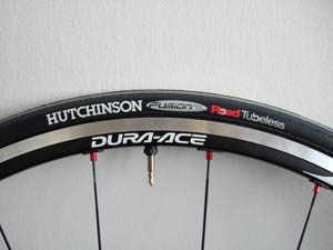 We are testing the Fusion tyres on the Shimano wheels, which run current model Dura-Ace hubs laced radially at the front and cross-two at the rear with bladed spokes. The key requirement for use with tubeless tyres is, of course, a non-perforated rim. The Shimano version locates the nipples in threaded sockets that are brazed onto the rim to avoid the need to penetrate it.