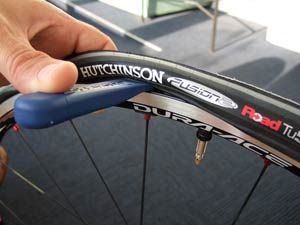 It also makes tyre installation a potentially more awkward task than with a conventional tyre, although on the plus side there is no tube to wrestle with and risk pinching. Fitment is in fact much as per normal but minus the tube. It does help to lubricate the tyre bead with soapy liquid prior to fitment. Hutchinson provides a special hollow tyre lever call STICK’AIR, which can be filled with liquid soap. A small sponge tip allows this to be applied to the bead without too much escaping and making a mess.
