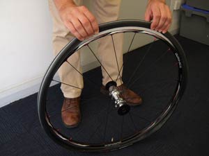 As you approach the valve the bead will go taut before it can be pressed over the rim, in a way that will be familiar to all clincher users. The fact that the bead has been lubed only makes matters worse, but to get the last bit over the rim, the bead must be pushed directly into the well all the way around. This was not too hard the first time we did it, a bit easier the second and pretty simple the third, and is in any case the correct way to fit any clincher.