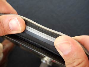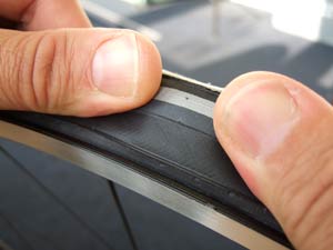 The rim’s inner face has the usual raised wall with hook form to hold the specially-shaped bead. As with motor vehicle tubeless tyre practice, there is a small lip just inboard of this; the bead pops over the lip when inflated. The lip both aids the air seal and keeps the bead in place when the tyre is deflated, the effect being secure enough to allow a tubeless tyre to be ridden flat.