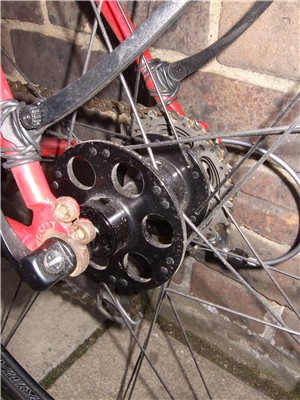 The latter is easily explained with reference to the rear wheel lacing pattern, which uses all 24 spokes tangentially. The non-drive spokes sit on a large-diameter flange while those on the drive side are laced to one more mid-sized. With 12 of them, all well-tensioned, pulling together, the wheel is torsionally stiff almost to a fault.