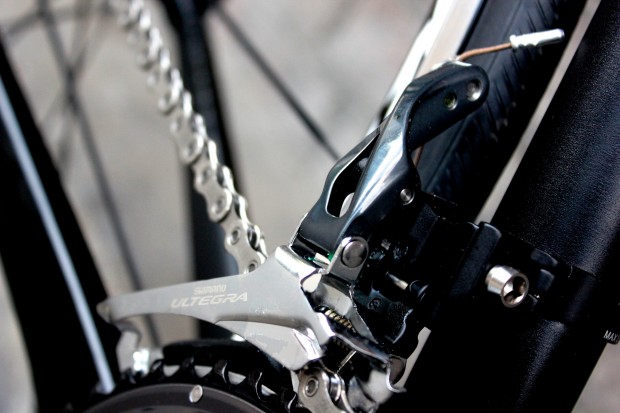 The flattened, pencil thin seat-stays provide a sharp visual contrast with the oversized tubes discussed above. The sudden switch from massive to minimalist, however, is unlikely to be the whim of the man at the Rose drawing board. Such slender profiles are frequently deployed in a bid to induce compliance in an area of the bike able to transmit shock from road to rider with depressing efficiency. Those on Cervelo’s R5, for example, are of similar appearance. We’ll be interested to hear from our man in the saddle about the effectiveness or otherwise of those deployed here in countering road vibration.