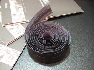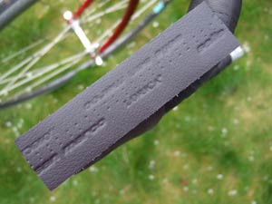 The tape is stiff – perhaps more so than leather – and relatively inflexible with a shiny outer surface and embossed San Marco and Lorica logos. It has a tapered cross section to ensure a ridge-free fit. Four colour options are on offer: Blue, Black, Red and White. Included in the pack are plastic end plugs, short lengths to tape to go behind the brake lever bands and finishing adhesive ribbons. The tape has an adhesive strip on the inside.