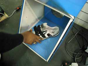 A large plastic bag is placed over the shoe, with a hose attached to a vacuum pump held under the middle strap