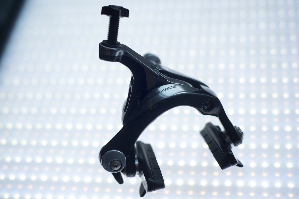 The new brake caliper is a dual pivot unit. The pivots are controlled by an internal roller cam mechanism, and can be used to attach the caliper to frames designed with mounting pegs. The caliper can also be attached by a conventional, central hanger, used additionally on the predecessor as a pivot point. Shimano weren’t able to show us the new time trial caliper, but explained it will be very similar with the exception of the long actuation arm. The front caliper will be more sculpted to fit aero frames. RadioShack-Nissan-Trek are expected to use them in this year’s Tour de France.