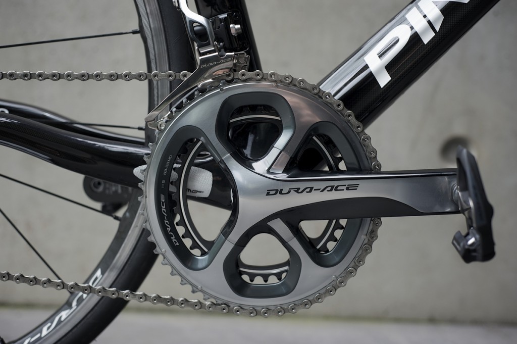 Other significant developments to the 9000 series Dura-Ace groupset include a lighter, four arm chainset, a dual pivot brake caliper possible to mount to an appropriately designed frame by its pivot points rather than a central hanger, a new pull ratio for the front mech, and polymer coated cables with a claimed reduction in friction of 10 per cent.