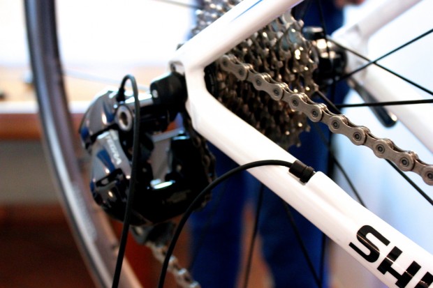 Shimano’s system relies on their E-tube, an electronic system that sends two frequencies over a single cable, sending power to a component and controlling how it behaves. Each compatible component (shifter or mech) is fitted with an electronic chip to filter the signal.