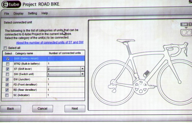 Shimano has launched Project E-Tube, software to support the programmable aspect of their Di2 electronic gear shifting systems, available only for PC platforms, but expected soon in a wireless protocol for Macs. The system allows the firmware of each compatible component to be updated and shifting to be customised. Components with the latest firmware are displayed by the software in green, or in orange for those that require updating.