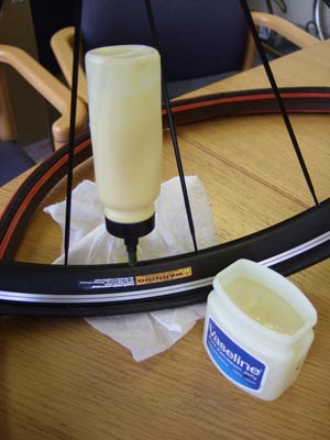 It is also formulated for tubes with Presta valves. As the box says, it is a tube sealant for roadies. Application naturally requires injection of the fluid through the valve. Not only is the sealant formulated to go through the orifice of a Presta valve, but this part of the valve must be greased prior to application. This we did using the recommended petroleum jelly.