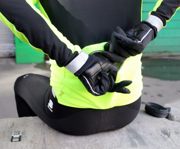 Our main gripe is with the rear pocket. Sportful have opted for one horizontal zipped pocket, rather than three vertical pockets. That means it’s difficult to organise, with your valuables rattling around alongside energy gels and the like, and it’s difficult to grab something while on the move. The problem can be partly solved by using a small saddlebag to keep an inner tube, tyre levers, multi-tool and energy gel, but we’d still like to see three pockets like on the No-Rain jacket. That aside, the pocket’s zip is waterproof, but anything inside is prone to getting a little clammy, even if the jacket is very breathable on the whole.