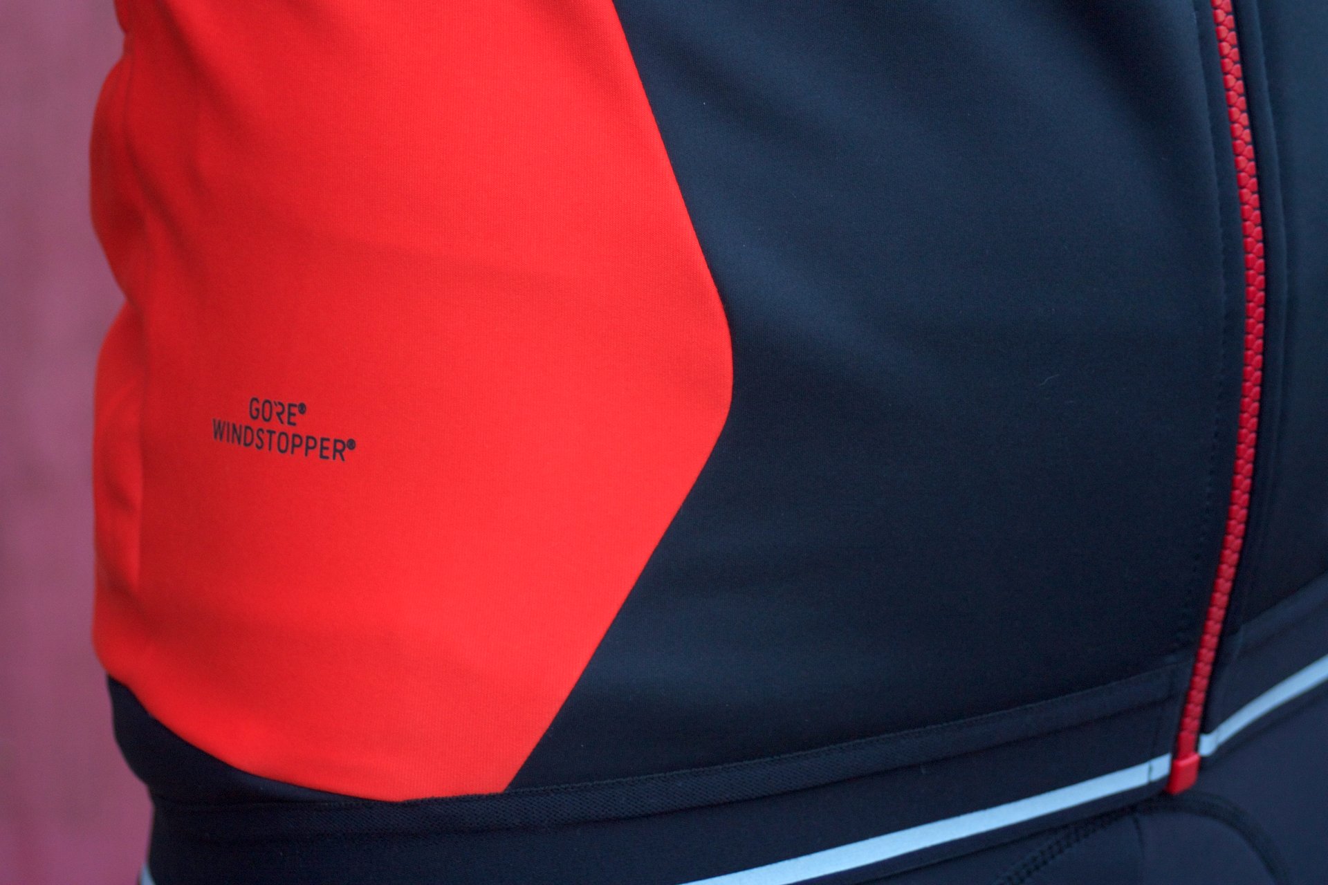 The jacket is primarily constructed from two fabrics from the specialists over at Gore: Windstopper Warm and Windstopper Mid. As the names suggest, they’re variations of the same fabric, with Warm the full-fat, 300g, fleece-backed, winter-weight fabric, and Mid about 25 per cent lighter while still providing the same windproofing and water repellent outer face.