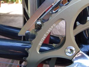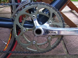 The Rival chainset, shown, has forged aluminium alloy crankarms with an integral hollow oversized steel axle press-fitted to the right-hand crank. The left hand crank is located through a splined socket and retained aluminium crankbolt with 8mm Allen socket. Both chainrings are ‘coined’, which gives then a work-hardened surface, and then hard-anodised for even greater durability. The usual ramps and pins ensure rapid, reliable shifting. The specification for the Force crankset is similar except for the use of carbon fibre crank arms.