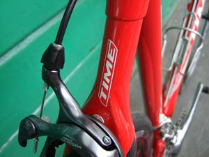 It’s worth running through the manufacturing technique because of what it allows Time to do with the way the resulting bike rides. Lugged construction allows for simple tube manufacture and gives the Racer a somewhat traditional look only partly dispelled by the slightly urgent graphics. Opinion is divided on their merits, with few onlookers expressing real enthusiasm. The reviewer’s opinion is favourable while admitting that the main colour and superlative finish make up for slightly odd lettering and lines. The bike looks pleasant enough without aspiring to the aesthetic heights of, say, a Pinarello.