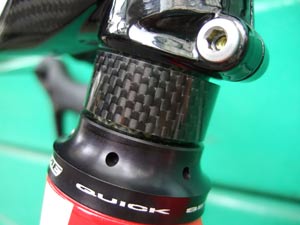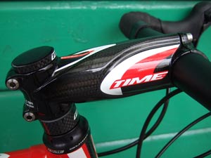The AVANT SAFE+ fork is all-carbon with a multi-diameter steerer tube, fat at the crown for strength and stiffness and a now-conventional 1 1/8” at the stem end for convenience. It turns in Time’s Quickset headset. A threaded aluminium sleeve is bonded to the steerer tube; a threaded collar tightens on this to adjust the steering bearing, and is kept in place by a compressed ‘O’ ring. The spacers on the steerer tube are purely cosmetic, and have thin ‘O’rings on their inside to stop rattling. One advantage of the system, which works very well indeed, is that the steering doesn’t have to be adjusted every time the stem is removed for, for example, packing in a bike box. Some Time owners have, however, expressed outrage at the price of replacement head bearings, which are, perhaps inevitably, made specifically for Time. The beefy handlebar stem has aluminium inserts at either end of a carbon central shell and takes an oversized handlebar. Clamping is done via just two M5 stainless bolts, but is secure.