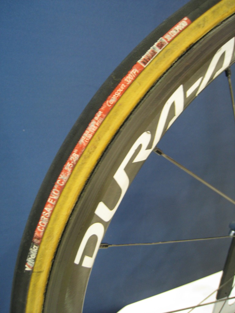 Lars Boom is a tall fella. At 6ft 3in he requires a large frame and that much is clear when taking a look at his setup. Check the huge drop from the saddle to the bars, fitted to a long stem. To get a satisfactory fit, Lars opts for a couple of spacers under the stem. Carbon Dura-Ace C35 wheels are shod with Vittoria Corsa Evo CX tyres, which from the picture look well worn.