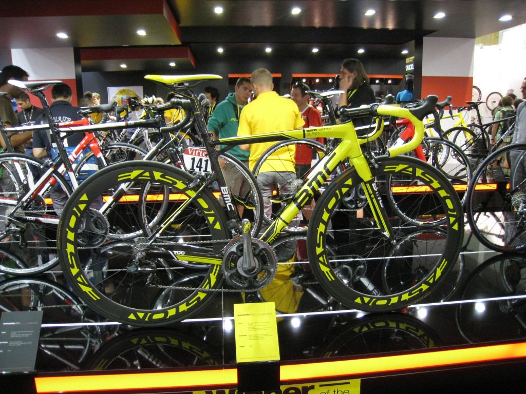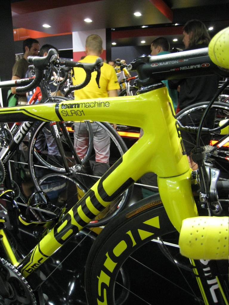 Cadel Evans’ Tour de France winning BMC Team Machine SLR01 took pride of place on BMC’s stand. The team and its suppliers pulled out all the stops to deliver a bike worthy of a Tour winner, with no part on the bicycle immune from a splash of yellow paint.