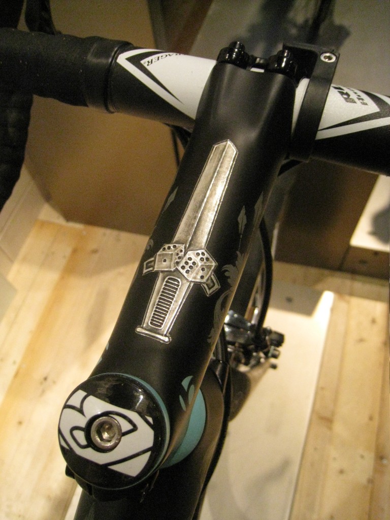The bike is packed with fantastic details, but two stand out more than any other. A first that we know of is the tyres being printed with Spartacus – that can’t be cheap to do can it? Secondly there’s the fantastic decoration on the massively long stem, about sums up the guy’s riding style really.