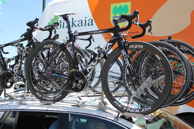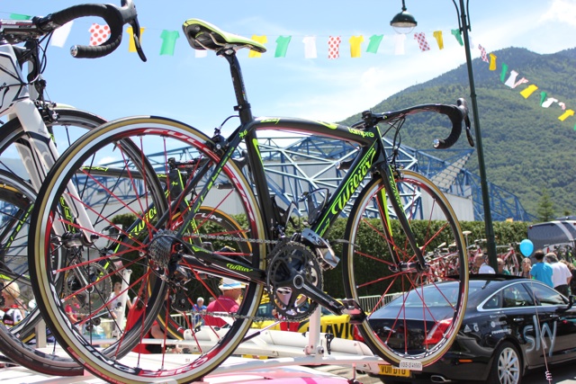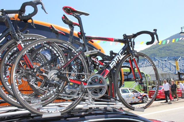 One of the perks for the riders contesting the GC for each of the various teams is having their machine on the right hand side, outer edge of the team car’s roof rack, making it easier for the mechanics to reach.