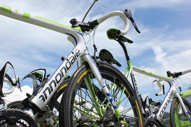 Vincenzo Nibali and Ivan Basso’s machines are both held on the outside of the team car: Nibali’s at the rear, and Basso’s at the front