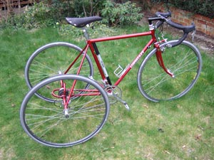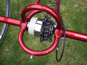The tricycle – or ‘barrow’ to the aficionado – in question is a George Longstaff Double Freewheel built about 10 years ago. George sadly died on a clubrun a few years ago but his invention, which allows either wheel to freewheel independently or bothto do so at once, inspired the thoroughly up to date www.trykit.com version based on a Shimano freehub body pattern. The Longstaff double, introduced in 1982, was built around a Maillard seven-speed ‘block’, which was the most reliable design available at the time.