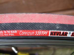 Weight for the 700x23c tyres is a claimed 210g, maximum inflation pressure is 145psi and, er, the tread pattern is a traditional file/herringbone job.