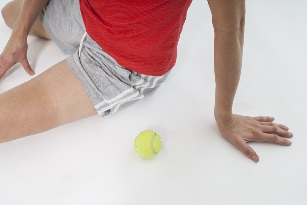 Position yourself sat next to a tennis ball with your front (left) hip/leg open at a right angle. Use your other leg with your foot flat on the floor, as well as your arms to lift yourself up and sit steadily and carefully back down with the tennis ball centred on your left buttock.